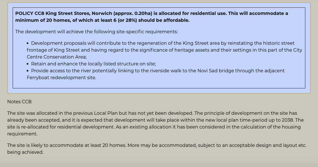 A total of 40 - 50 dwellings was proposed for the whole (extended) site. Only the King Street Stores site, for a total of 20 dwellings, was carried forward to the GNLP call for sites Regulation 18 document under the reference CC8. This has been carried forward to the Part 2 Site Allocations.