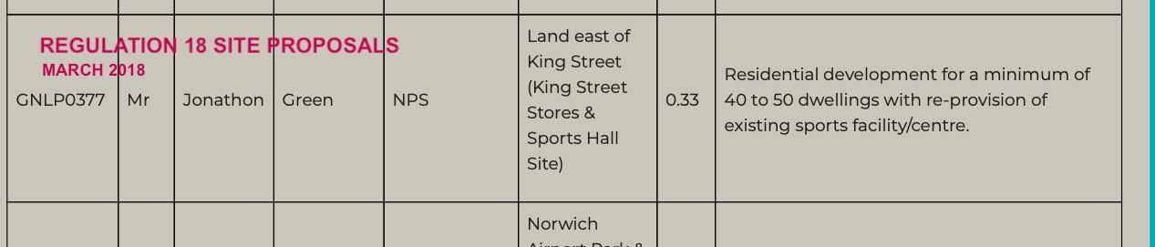 The original call for sites for the ultimately adopted 2014 Norwich Local Plan included 'an extended CC9 allocation' to include the King Street Stores and Wensum Sports Centre (formerly the Lincoln Ralphs Sports Hall). ref. REPORT ON THE EXAMINATION INTO THE NORWICH SITE ALLOCATIONS AND SITE SPECIFIC POLICIES LOCAL PLAN dated 13.10.14. See attached.