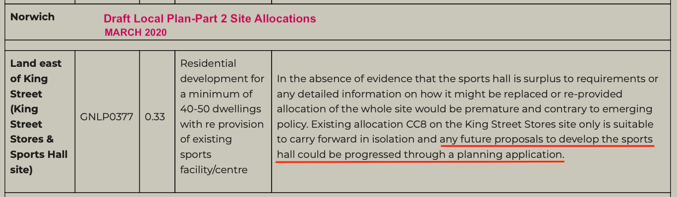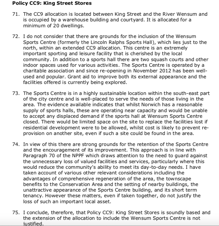 The inspector concluded that the proposal for the 'King Street Stores is soundly based' and that 'the extension of the allocation to include the Wensum Sports Centre is not justified'.